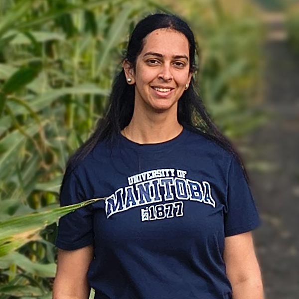 Dhillon earned her bachelor’s and master’s degrees in agricultural biotechnology at Punjab Agricultural University, then completed her PhD in plant science at the University of Saskatchewan. After her PhD, she worked as a postdoctoral fellow on agronomy and plant breeding-related projects before moving to Winnipeg in 2024. She lives with her husband, two-year-old son and mother-in-law.