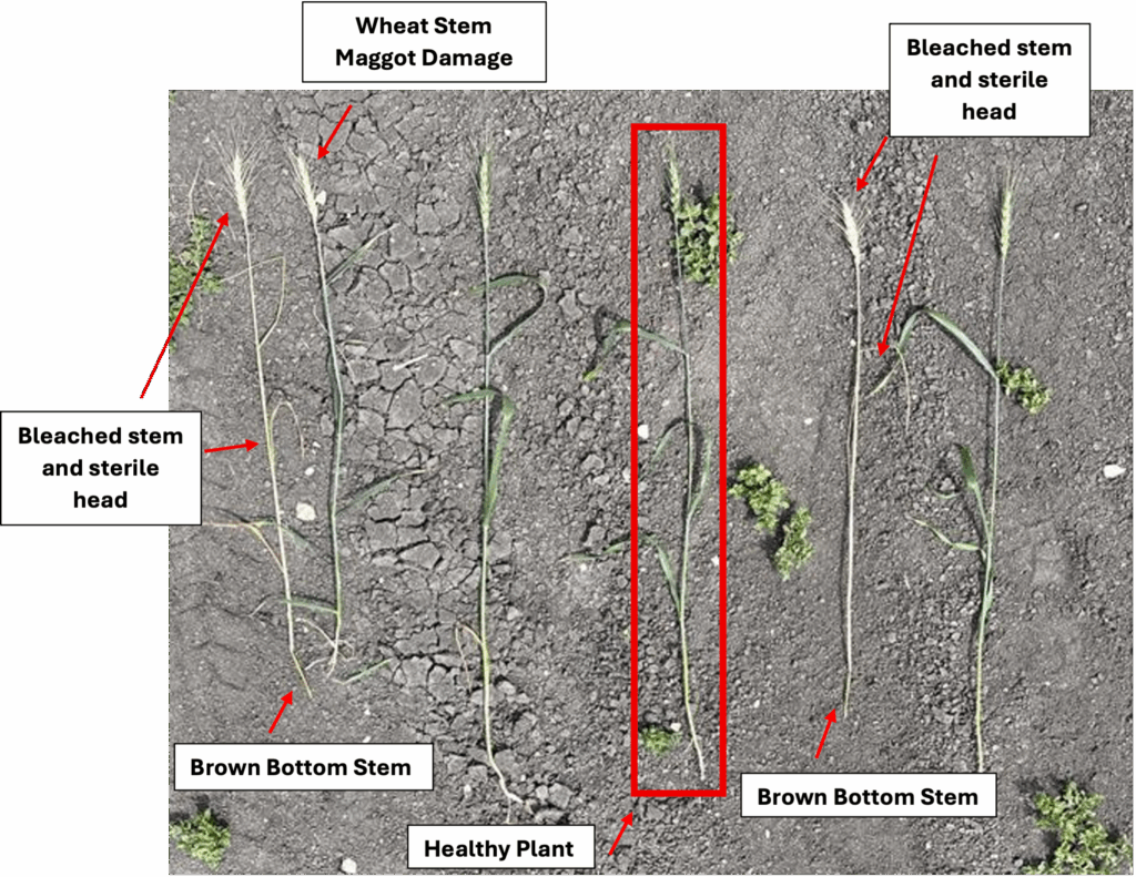 Later season symptoms (Figure 3) include premature ripening especially in severely infected plants, with plants having sterile heads or heads with shrivelled kernels. Green colour of these plants can be lost, and the stems and heads can be bleached. Plants can be easily pulled from the ground and can be conspicuous compared to healthy green plants. The bottom of the stem may have honey brown colouration or brown lesions (Figure 3).