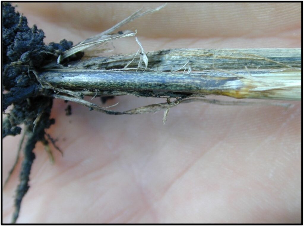 Figure 4. Shiny black fungal growth on the bottom of the stem, a prominent Take-all symptom in wheat. Photo Credit: Dr. Kelly Turkington.
