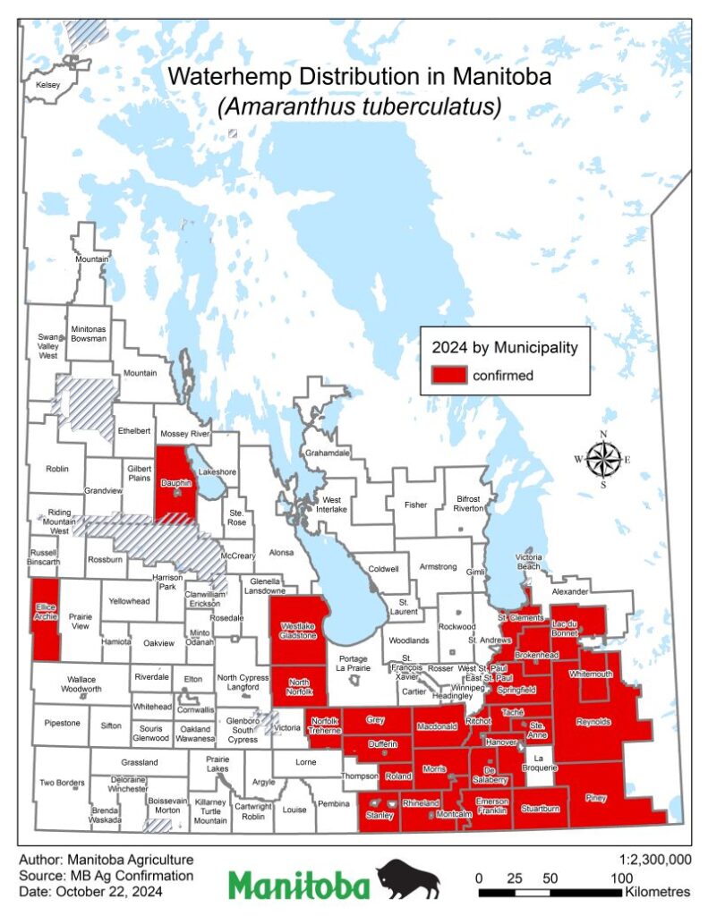 Distribution of waterhemp in Manitoba. Map indicates municipalities where waterhemp has been found, up to and including the 2024 crop season. Courtesy of Manitoba Agriculture.